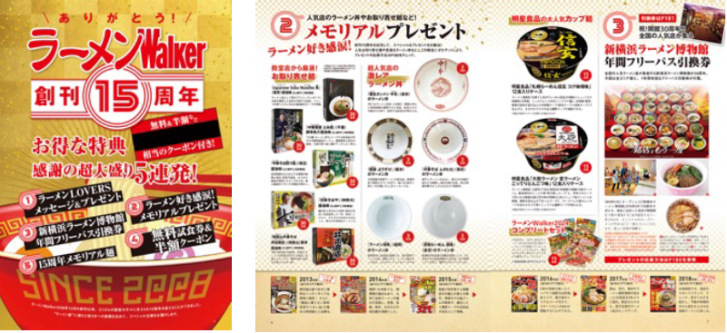 創刊15周年特大号は、全エリアで昨年よりページ数を増量。巻頭企画では、無料や半額で絶品ラーメンを試食できるお得な特典をはじめ、歴代表紙出演者など「ラーメンWalker」ゆかりのラーメンLOVERSからのメッセージ、激レアラーメン丼や人気お取り寄せ麺などが当たるプレゼント企画など、うれしいコンテンツが盛りだくさんの内容です。