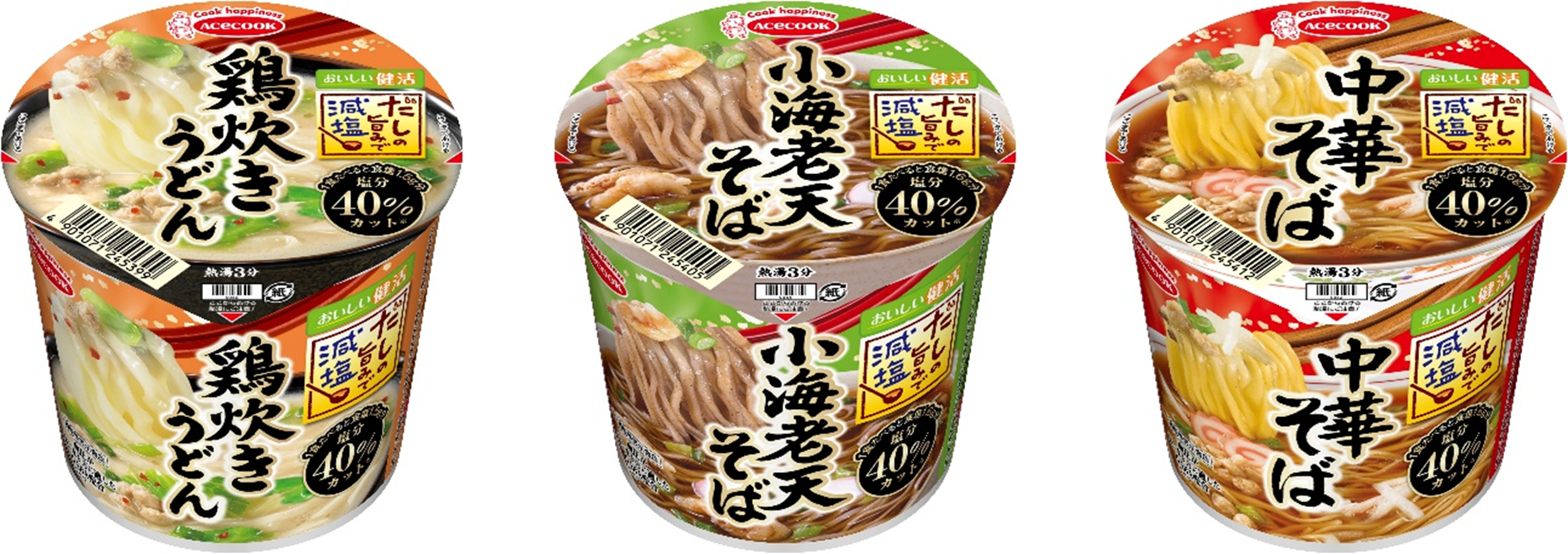 ① 『だしの旨みで“おいしく”減塩!』をテーマに、だしの風味が食欲をそそる、塩分を40%カット※した減塩カップめんシリーズ!