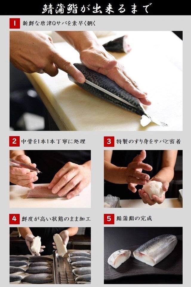専用工場を作り、火入れをしない特殊技法×超冷凍技法にたどり着き、「唐津Qサバ」と「特製すり身」を密着・一体化させることに成功しました。