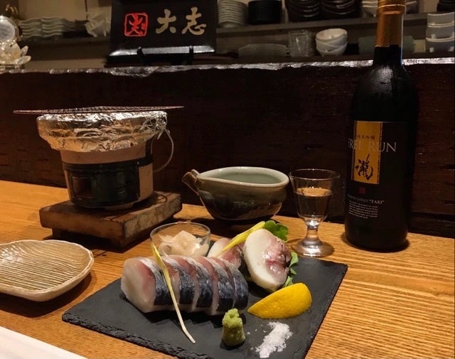 当店を経営するのは、唐津市呉服町商店街にある創作和食店「大志」。自然豊かな唐津で厳選された海の幸・山の幸をふんだんに使い、形に捕らわれない創作料理を提供しています。店内へ一歩踏み入れると、随所に散りばめられた店主のこだわりと落ち着いた雰囲気が日常の忙しさを忘れさせてくれます。力強さと繊細さ・生の息吹を感じられる力強く生けられた花装飾が、引き締まった空間を演出。そして、料理をより彩るために作られた焼き物の数々。