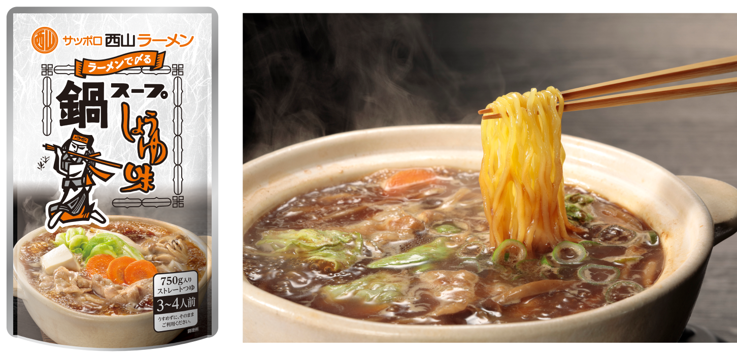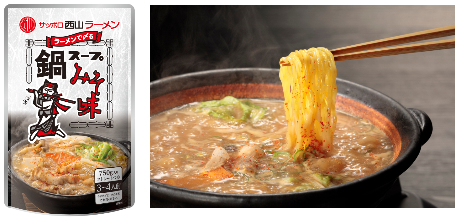 「西山ラーメン ストレート鍋つゆ」は、北海道のみなさまに長年ご愛顧いただいている「サッポロ西山ラーメンスープ 2食入」をベースにした鍋スープです。ご家庭では人気の高い生ラーメンを、お鍋として、お肉や野菜とともに楽しんでいただきたいという想いから、鍋スープを開発いたしました。味噌ベースで仕立てた豚肉と野菜によく合う「味噌味」と、醤油ベースで仕立てた鶏肉と野菜によく合う「醤油味」の2種類が登場。〆は残ったスープにラーメンを入れて、お好みの具材をトッピングすることで、普段とはひと味違うサッポロ西山ラーメンをお楽しみいただけます。