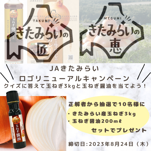 ◎応募方法:期間中、JAきたみらいのロゴリニューアル インタビュー動画を視聴し、クイズに回答すると、正解者の中から抽選で10名様に、生産量日本一を誇る玉ねぎ3kgと玉ねぎ醤油 200mlが当たります。