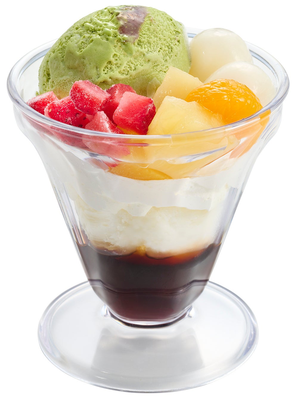 「老舗茶舗の宇治抹茶フルーツ和パフェ」は、本格宇治抹茶アイスが主役の和パフェです。「森半」が手掛けた上質な宇治抹茶と北海道産小豆を使用したあんこソースを練りこんだアイスは、抹茶の程よい苦みと甘み、香り高さが自慢です。その他に、コクのある沖縄県産の黒糖を使用した黒糖ゼリーダイス、シャリシャリの練乳グラニタ、もちっとした白玉、カラフルなミックスフルーツにフローズンいちごダイスをのせ、1つで様々な食感をお楽しみいただけます。