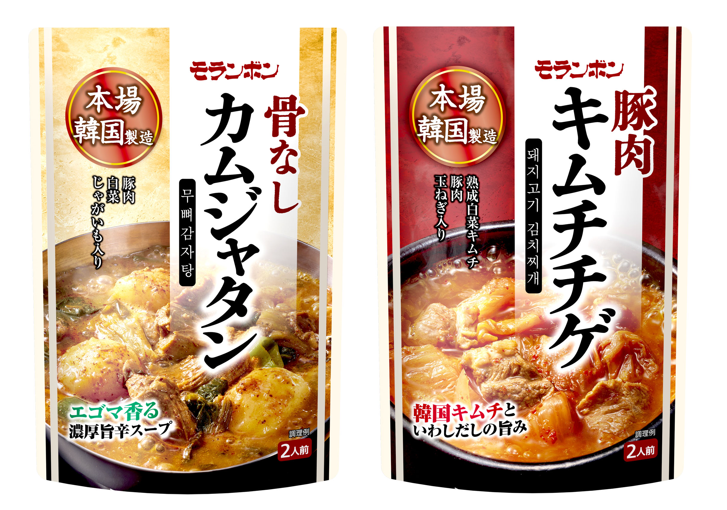 キムチ鍋つゆの市場はコロナ禍前よりも拡大していますが、市場の約9割が調味料であり、具入りのレトルトスープ形態のものはスーパーでは取り扱いが少ないのが現状です(KSP-POS 全店千人金額(全国) 22年度 9-2月)。そこで本格感がありながら日本人の味覚にも合う味わいにこだわった、日本では食べられる機会が少ない具入りレトルトスープの「骨なしカムジャタン」と韓国産キムチを使用した「豚肉キムチチゲ」を発売します。