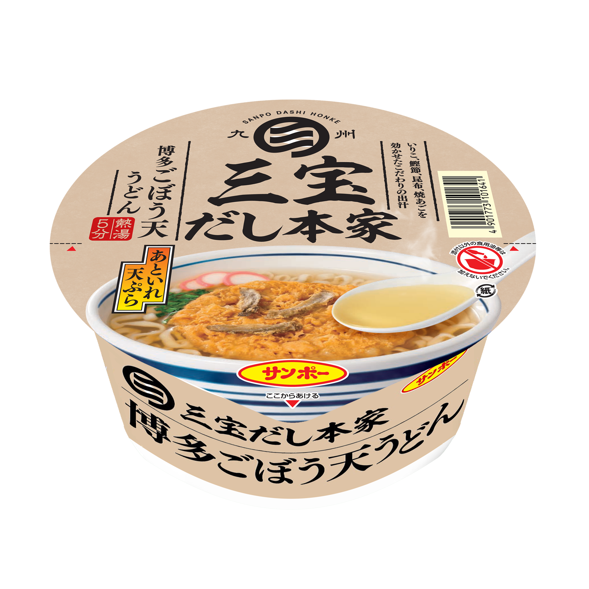「ごぼう天うどん」は長年ご愛顧いただき、おかげさまで今年で発売39年目を迎えました。今後も末永く九州の味わいをお楽しみいただけるよう、新たに「だし」にこだわった「三宝だし本家」としてブランドリニューアルし、商品やパッケージを見直しました。「三宝だし本家 博多ごぼう天うどん」は、博多のお店で食べるような「だし」が効いた澄んだスープが特長です。いりこ、鰹節、昆布、焼きあごなどを贅沢に使用した、博多らしく上品ながらもしっかりとした「だし」の味わいをお楽しみいただけます。また、「めん」はさらにふんわり、もっちりとした九州のうどんらしい食感になり、具材の「ごぼう天」はごぼうを増量しよりサクサク感を味わっていただけるよう後入れになりました。だし感際立つ博多定番の一杯をお楽しみください。
