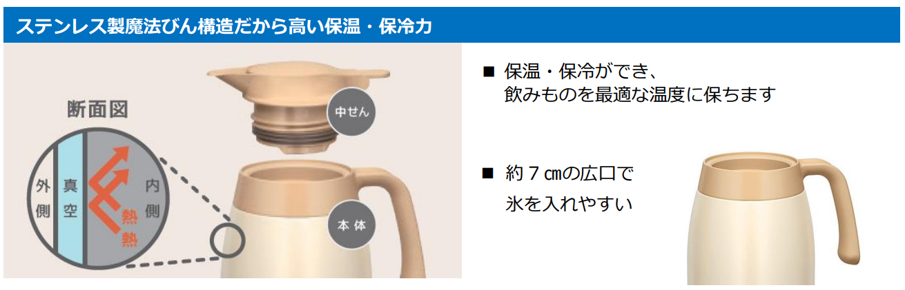 『サーモス ステンレスポット(TTB-1001/1501/2001)』は、ステンレス製魔法びん構造で保温・保冷ができ、飲みものを最適な温度に保つ卓上用のポットです。押すだけで注げるワンタッチレバーで、片手で簡単に注ぐことができ、倒れてももれない安心設計です。また、本体は約7cmの広口で氷も入れやすく、手を入れて奥までしっかり洗えるのも特長。中せんは、パーツが細かく取り外せて内側の流路まで洗いやすく衛生的です。