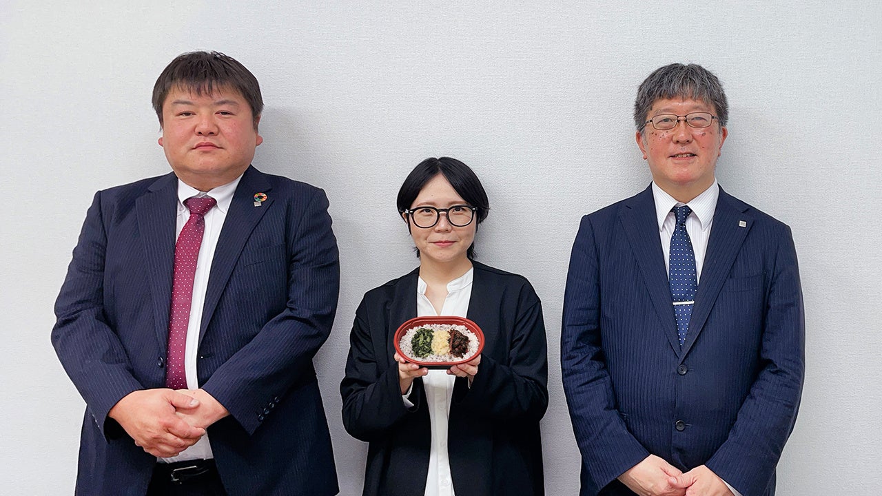 写真:左から だけ弁当シリーズの産みの親・ウインナー部長こと林弘昭(東日本運営本部・副本部長)、広報の池内友子、商品部の山田克徳