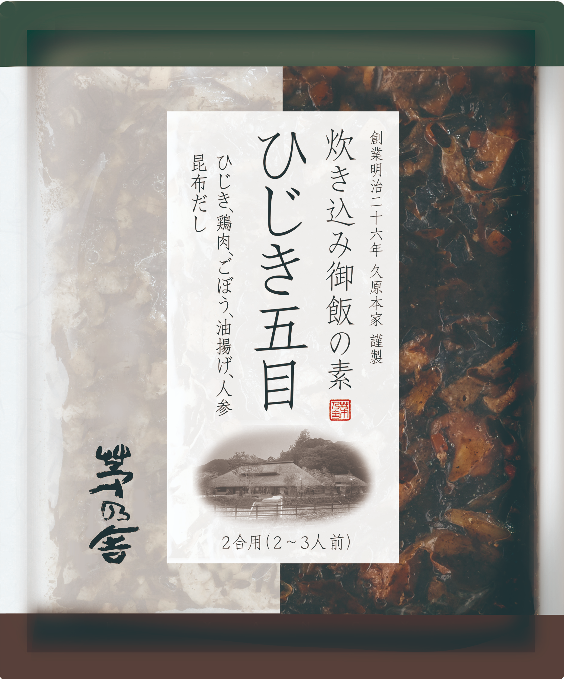 茅乃舎では、素材の味や風味を大切にした‘’御飯の素‘’シリーズを展開しています。ご飯に混ぜるだけ、炊き込むだけの手軽さで人気のシリーズです。今回新発売の「炊き込み御飯の素 ひじき五目」は、ひじきのふっくらとした食感を生かしています。他にも、鶏肉、ごぼう、油揚げ、にんじんを加え、うまみ豊かな炊き込み御飯の素に仕上げました。炊き立てはもちろん、冷めても美味しいので、これから秋にかけての新米の季節におすすめの逸品です。