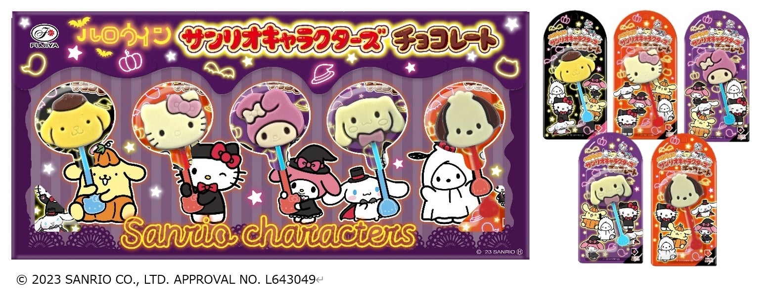 ・株式会社サンリオの人気キャラクター、ポムポムプリン、ハローキティ、マイメロディ、シナモロール、ポチャッコの顔をかたどった可愛い棒付きチョコレート「サンリオキャラクターズチョコレート」からハロウィン限定デザインが登場