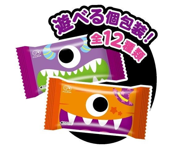 ※「ハロウィンカントリーマアム(バニラ&キャンディアップル)」と「ハロウィンホームパイ(バター&紫いも)」の個包装デザインはそれぞれ12種類。一緒に混ぜてゲームをお楽しみいただけます。