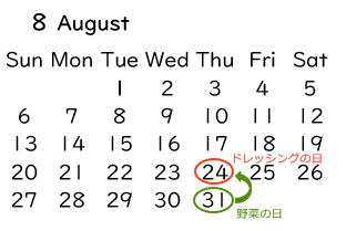8月24日はケンコーマヨネーズが制定した「ドレッシングの日」です。ドレッシングは野菜にかけて使用することが多いことから、831(やさい)にかける(かけ算をする)→「8×3×1=24」で24日を、また、カレンダーで見ると「野菜の日(8月31日)」の真上にあるのが8月24日であることから、野菜にドレッシングをかける様子をイメージし、「ドレッシングの日」と制定しました。