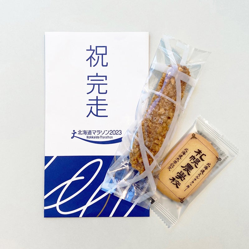 「きのとや風の音」「札幌農学校 北海道ミルククッキー」各1個ずつを袋に入れてお渡します。18,000人分を用意し、ランナーの皆さんに少しでも喜んでいただければとの思いでボランティアの方々が手渡して、応援させていただきます。