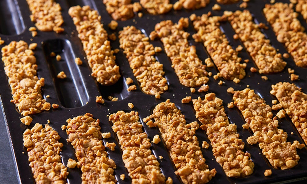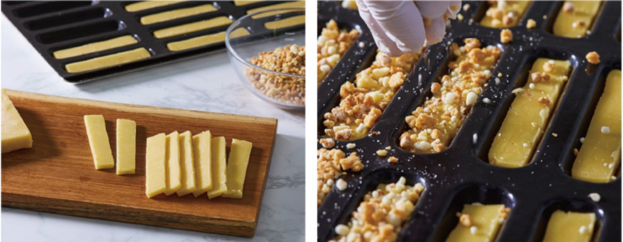 1層目のサクサク食感のクッキー。2層目はクロッカンとパイを乗せたザクザク、カリカリ食感。2層仕立にした手間のかかる製法が、こだわりのおいしさを叶える秘訣です。