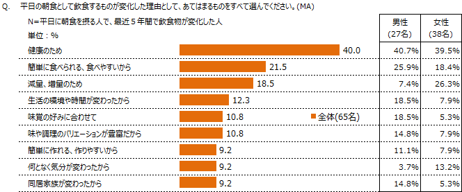 最近5年間で平日の朝食内容が変化した理由としては、男女とも「健康のため」の割合が最も多くなりました。