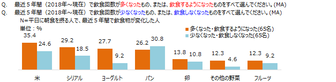 平日の朝食内容として、ヨーグルトやシリアルの飲食回数が増えて、パンの飲食回数が減っています。コロナ禍を含む最近の5年間は外出機会が減るなどの生活の変化がありました。運動不足による健康不安や体型変化をきっかけに食事内容を見直す人も多かったようです。新型コロナウイルス感染症は5類感染症に移行しましたが、そのときの生活スタイルは少なくとも朝食にはまだ残っています。今後、生活スタイルが正常に戻るなかで、それがどのように変化していくのかが注目されます。