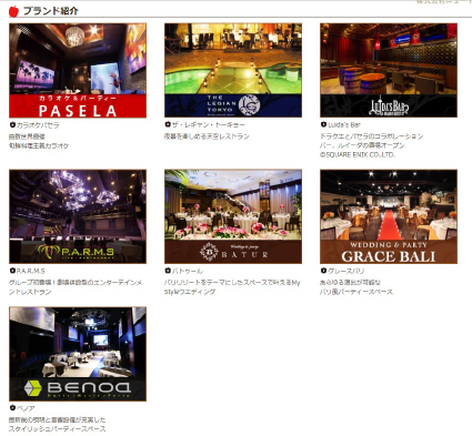 代表ブランド:カラオケパセラ(カラオケ事業)/愛犬ビレッジ、マームガーデン(ホテル事業)/モンハン酒場、仮面ライダーザダイナー(コラボカフェ事業)/あんしんつぼみ保育園(保育事業)等