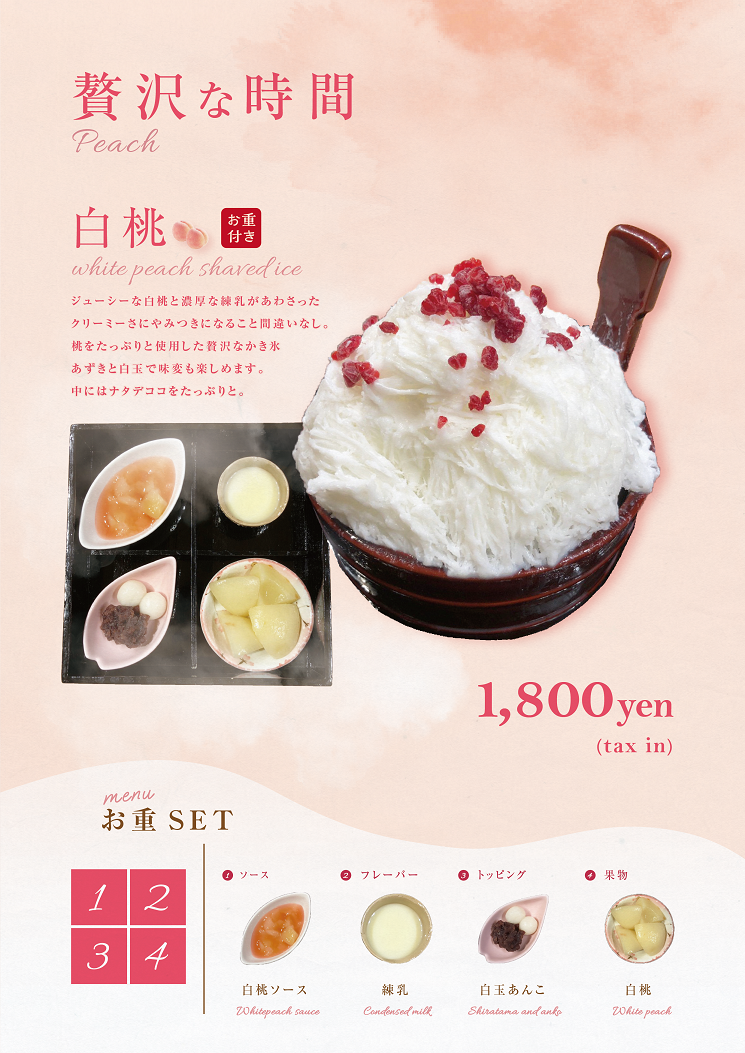 *白桃・・・ジューシーな白桃と濃厚な練乳があわさったクリーミーさにやみつきになること間違いなしの商品。桃をたっぷりと使用した贅沢なかき氷はあずきと白玉で味変も楽しめます。(中にナタデココ入り)