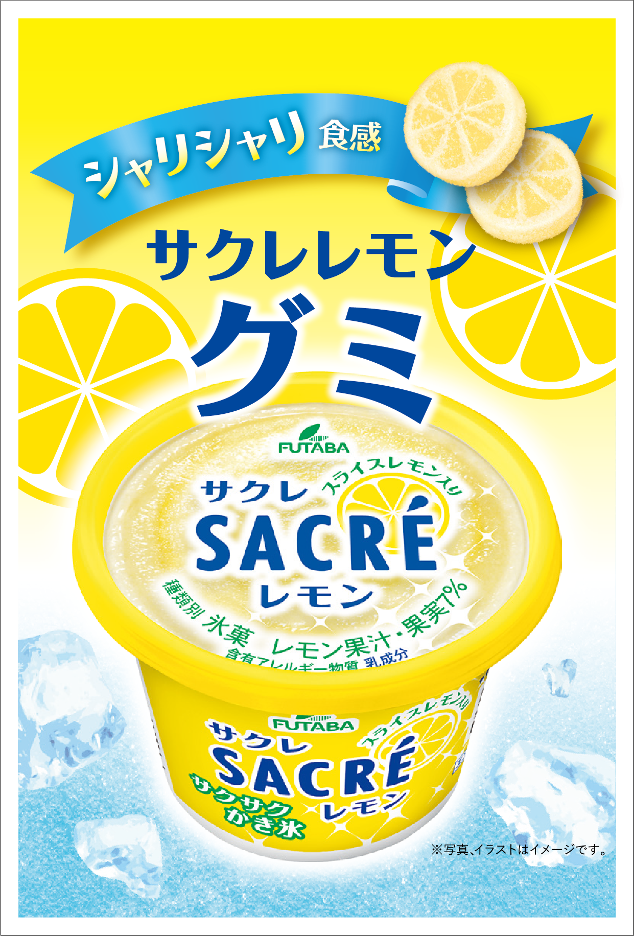 商品特徴:シャリシャリとした食感のレモンアイスとスライスレモンが特徴的な氷菓「サクレレモン」とのコラボお菓子。レモン型グミでサクレのスライスレモンを表現し、表面にはすっぱいパウダーをかけてレモンの爽やかな甘酸っぱさを演出しました。
