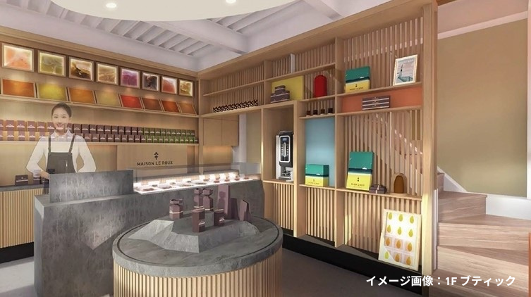 店内は、台地や木をモチーフとした空間づくりに海を想起させる青を合わせ、メゾン・ルルー発祥の地である自然豊かなフランスブルターニュを表現しています。