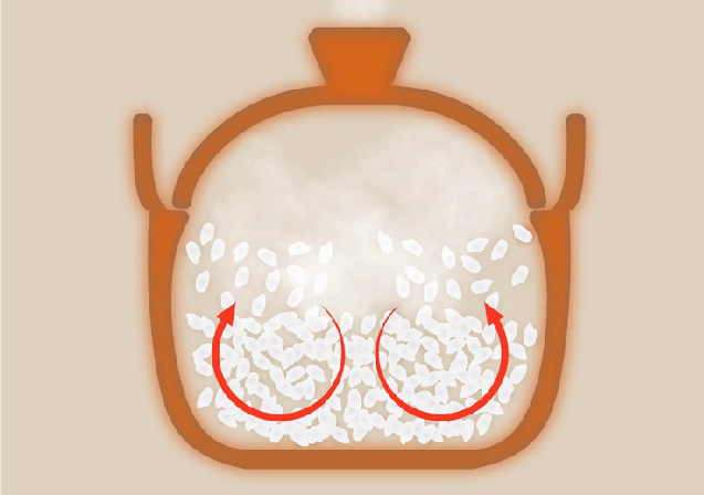 底から上層へ対流が生まれると熱が均一に伝わり、一粒一粒がふっくらと膨らみ美味しく炊きあがります。