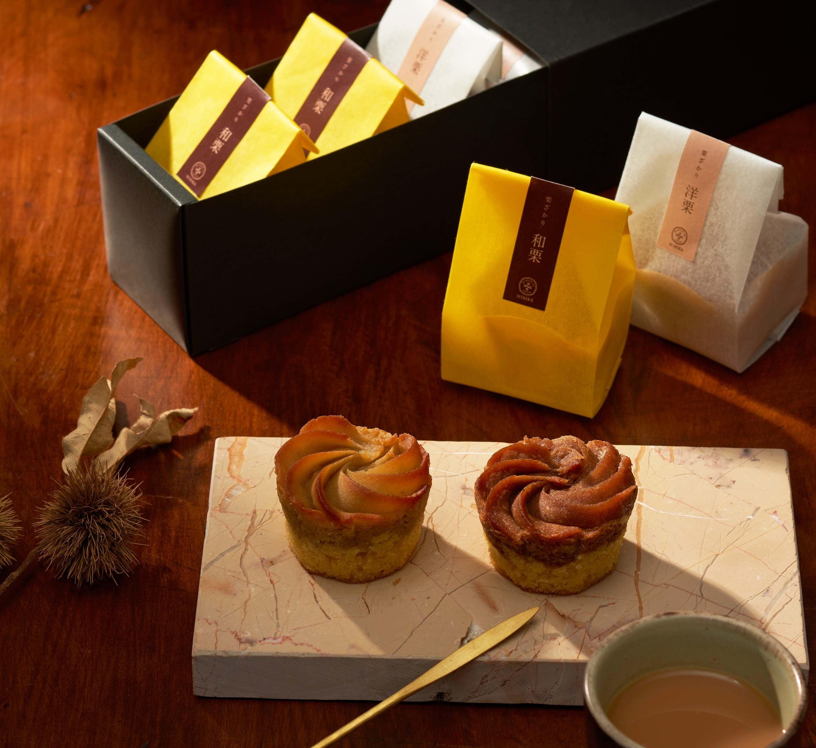 9月1日( 金 )からは、和栗と洋栗、自家製の2 種類の栗ぺーストをそれぞれアーモンドとバターを合わせたしっとり生地に絞って香ばしく焼き上げた贅沢な味わいの「栗ざかり」や、秋のクッキー(ポルボロン)、人気のクッキー缶など、秋のご挨拶にもおすすめの焼き菓子をご用意しました。 四季折々の HIBIKA の四季菓子を、どうぞお楽しみください。