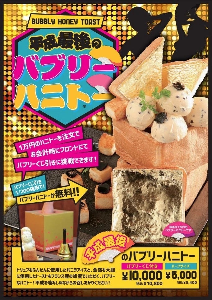 平成最後の2019年、平成最後を胸に焼き付け、さらに新年を祝う、目にも華やかな「平成最後のバブリーハニトー」を期間限定で販売しました。