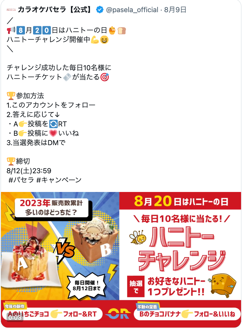 内容:「チョコバナナハニトー」「いちご&チョコづくしハニトー」のうち、2023年の販売数累計が多かった方を選びいいねかリツイートをしていただき、正解した方の中から毎日10名の方にお好きなハニトーが選べるチケットをプレゼント