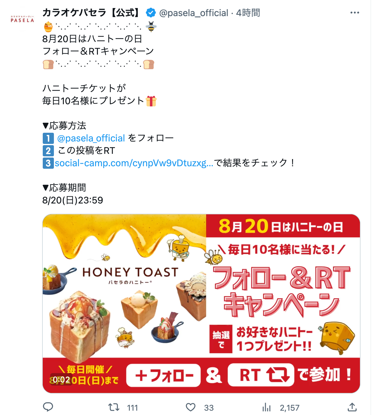 また、現在は8月20日までの期間限定でパセラの公式X(Twitter)アカウントのフォロー&リツイートキャンペーンも行っています。