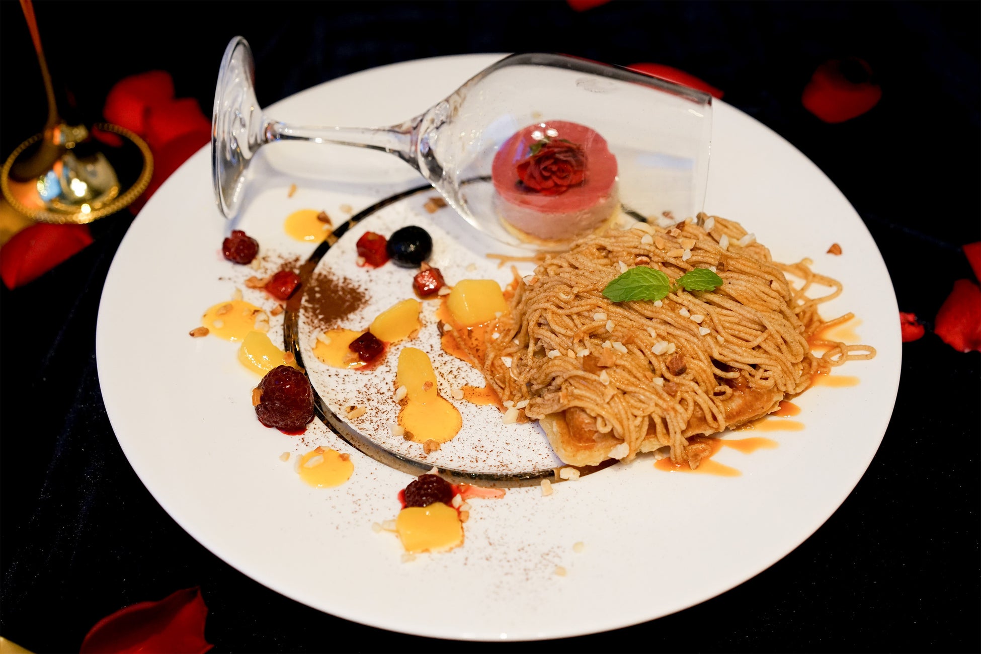 看板メニューのクロッフルで美女と野獣の世界観を表現した一品。お皿の上に転がるグラスにはバラの儚さをイメージしたスイーツを。見た目と味で美女と野獣の世界観を存分にご堪能ください。