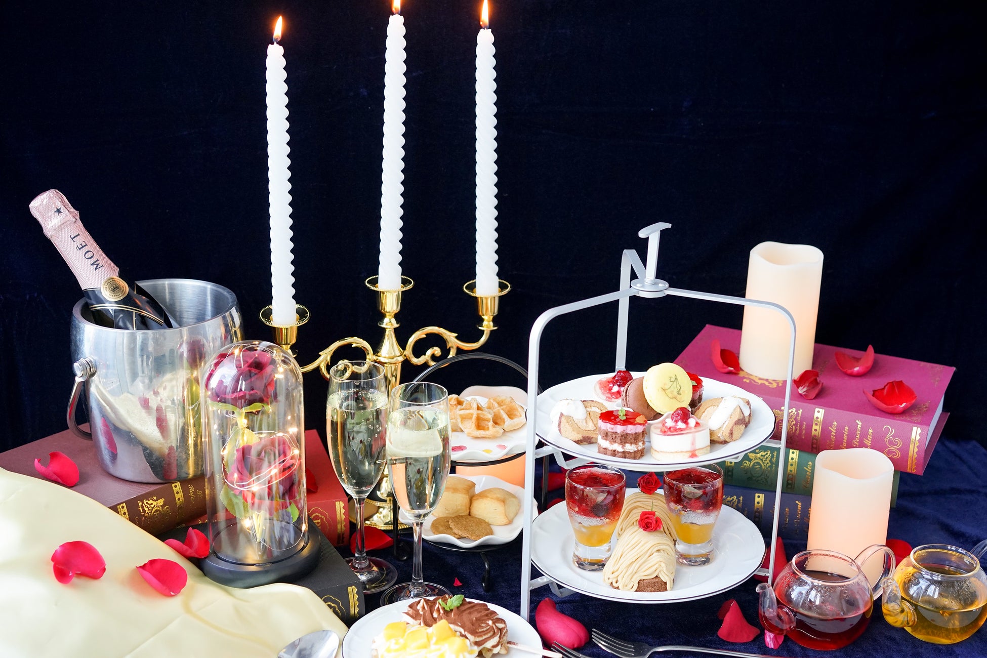 看板メニューのアフタヌーンティーには、美女と野獣をテーマに、純真な美女と野獣の愛を表現したスイーツが並びます。ムース、モンブラン、ロールケーキ、ゼリー、マカロンなど、様々な食感・風味をお楽しみいただけます。