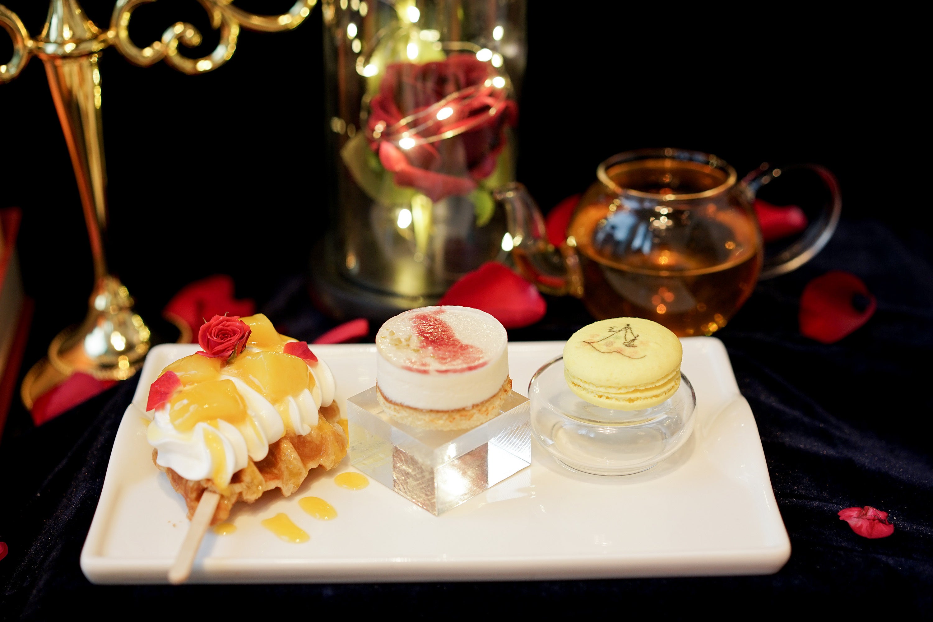 看板メニューのアフタヌーンティーには、美女と野獣をテーマに、純真な美女と野獣の愛を表現したスイーツが並びます。ムース、モンブラン、ロールケーキ、ゼリー、マカロンなど、様々な食感・風味をお楽しみいただけます。