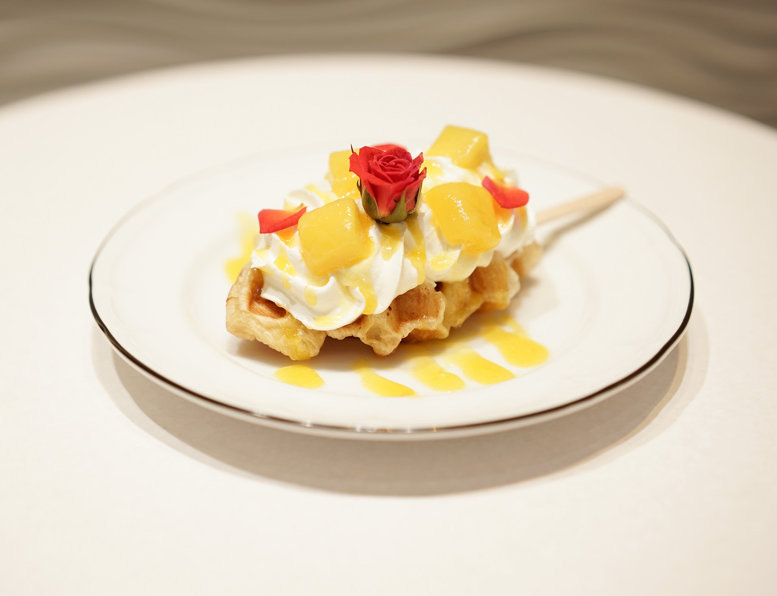 看板メニューのクロッフルには、男女問わず人気の高いマンゴーに”美女と野獣”をイメージしたバラのエディブルフラワーをトッピング。マンゴーフルーツとお花で看板メニュークロッフルを彩りました。