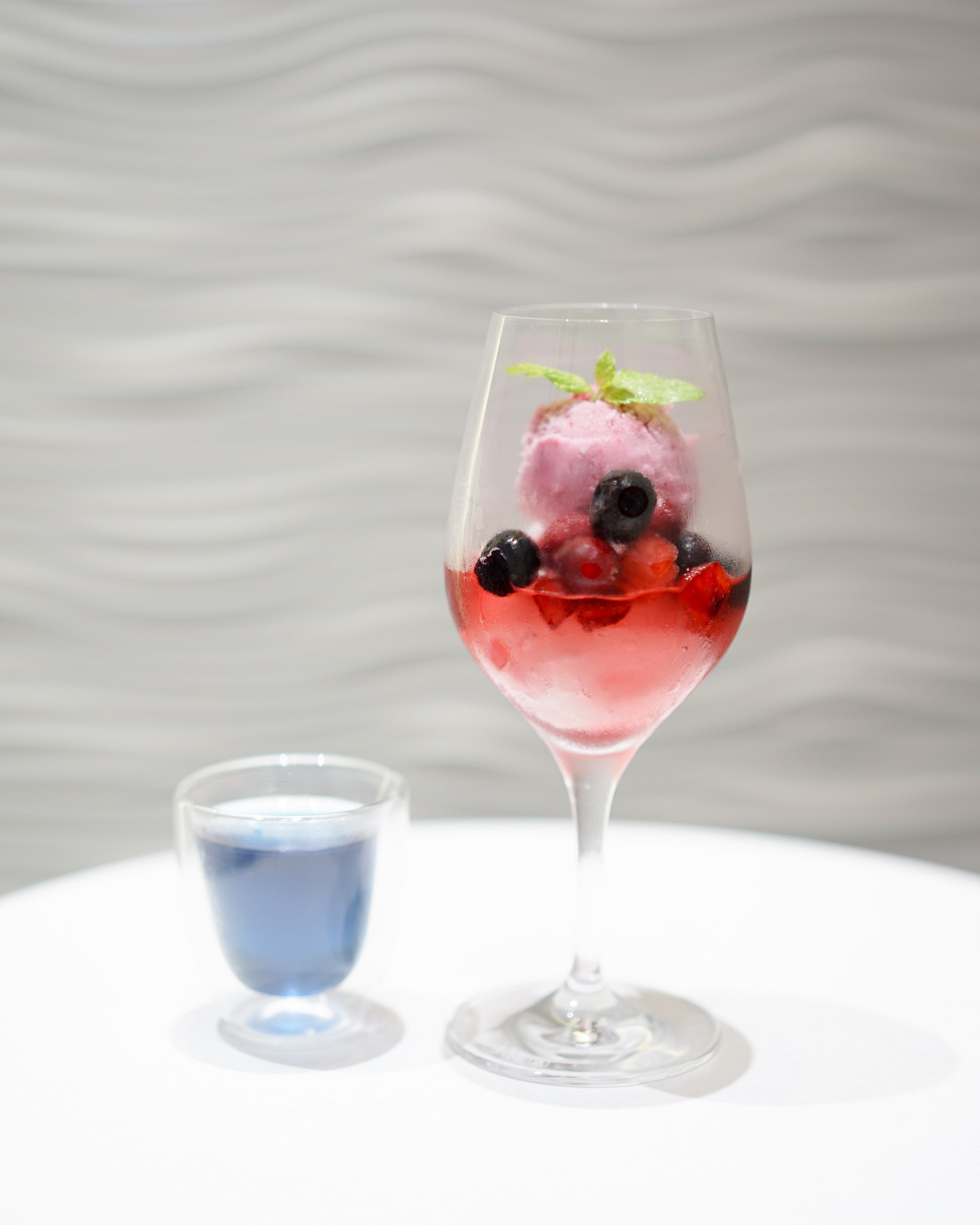 オリジナルブレンドティーを使用したスペシャルカクテルには、ジェラートを使用したフォトジェニックなカクテルが仲間入り。赤いゼリーにはオリジナルティーのLULLABYを使用、そこに青いオリジナルティーMIRAGEを優しく注ぐと魅惑的なパープルカラーに早変わり、温かい紅茶と冷たいジェラートの絶妙なバランスで魔法を表現した一杯です。ノンアルコールも対応可能となっております。