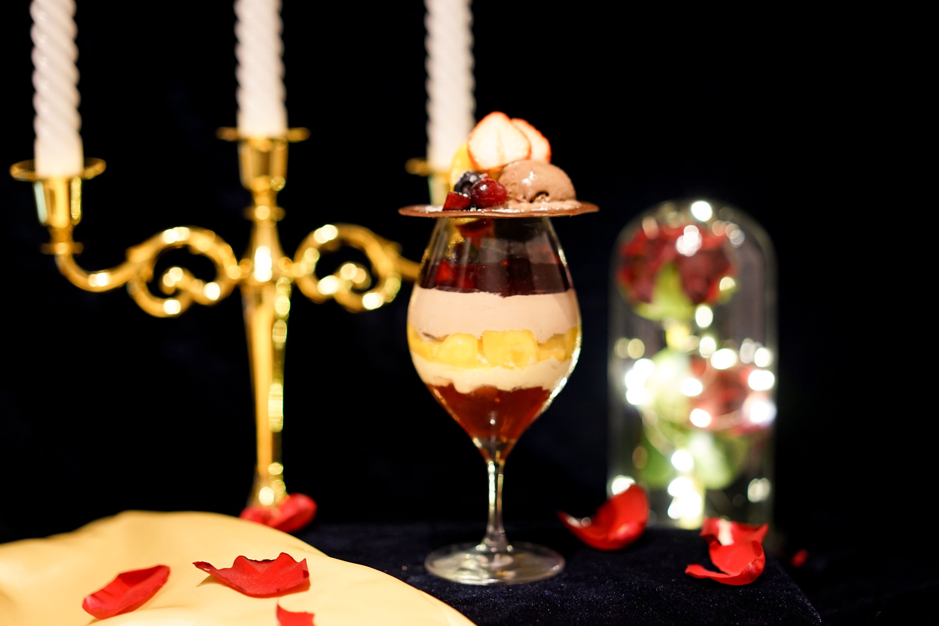 美女と野獣の世界観を表現したフォトジェニックなパフェ。マンゴーフルーツやブラウニーなど美女と野獣のカラーをイメージしたスイーツで構成しており、チョコレートの蓋を開くと中にはある仕掛けも。物語の世界観を忠実に再現したパフェの味はもちろん、見た目もお楽しみください。