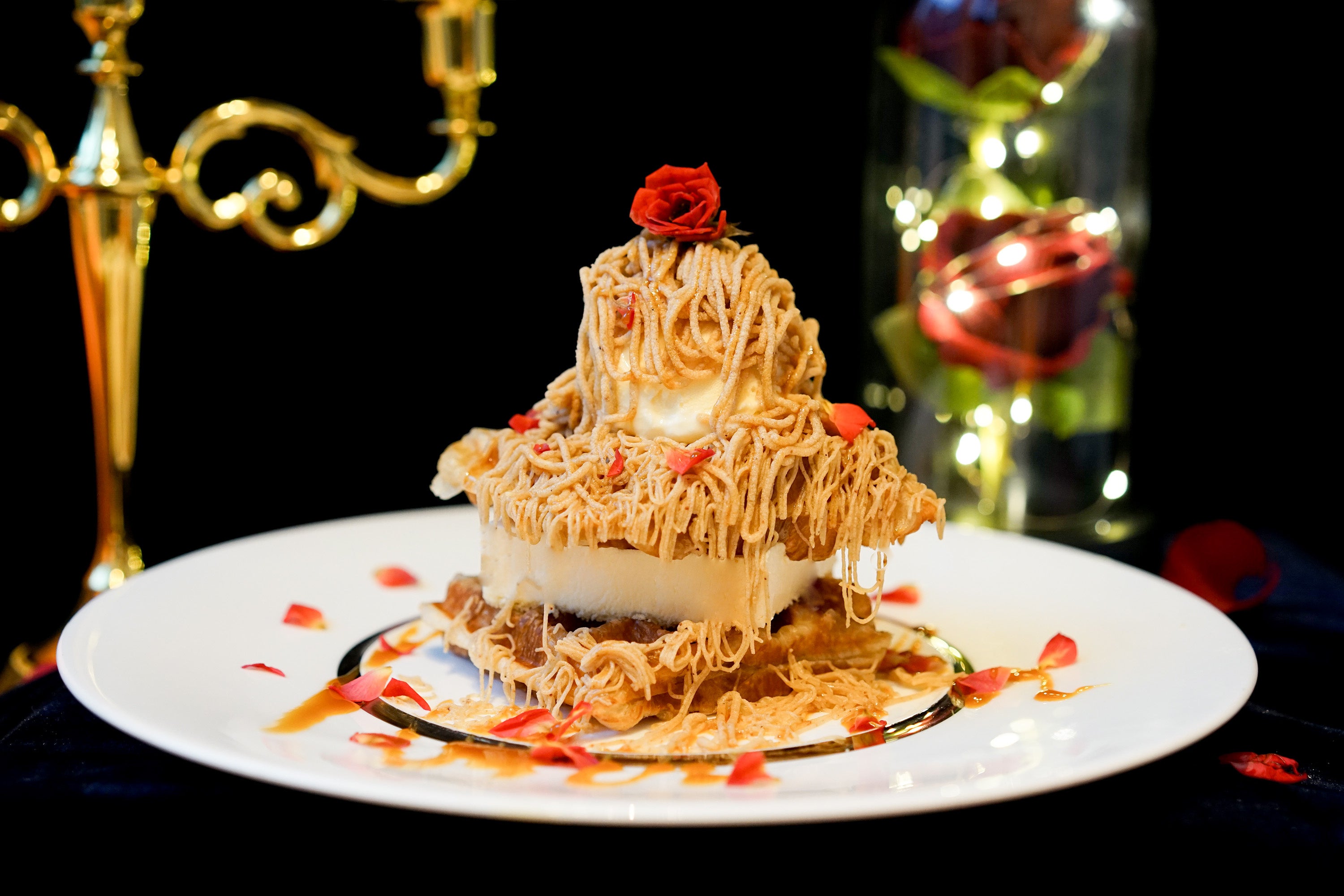 ちょっと大人のスイーツリッチクロッフルにはモンブランとバラのお花でビーストを表現した魅惑のスイーツが誕生。フォトジェニックな見た目で、写真映えすること間違いなしの一品です。