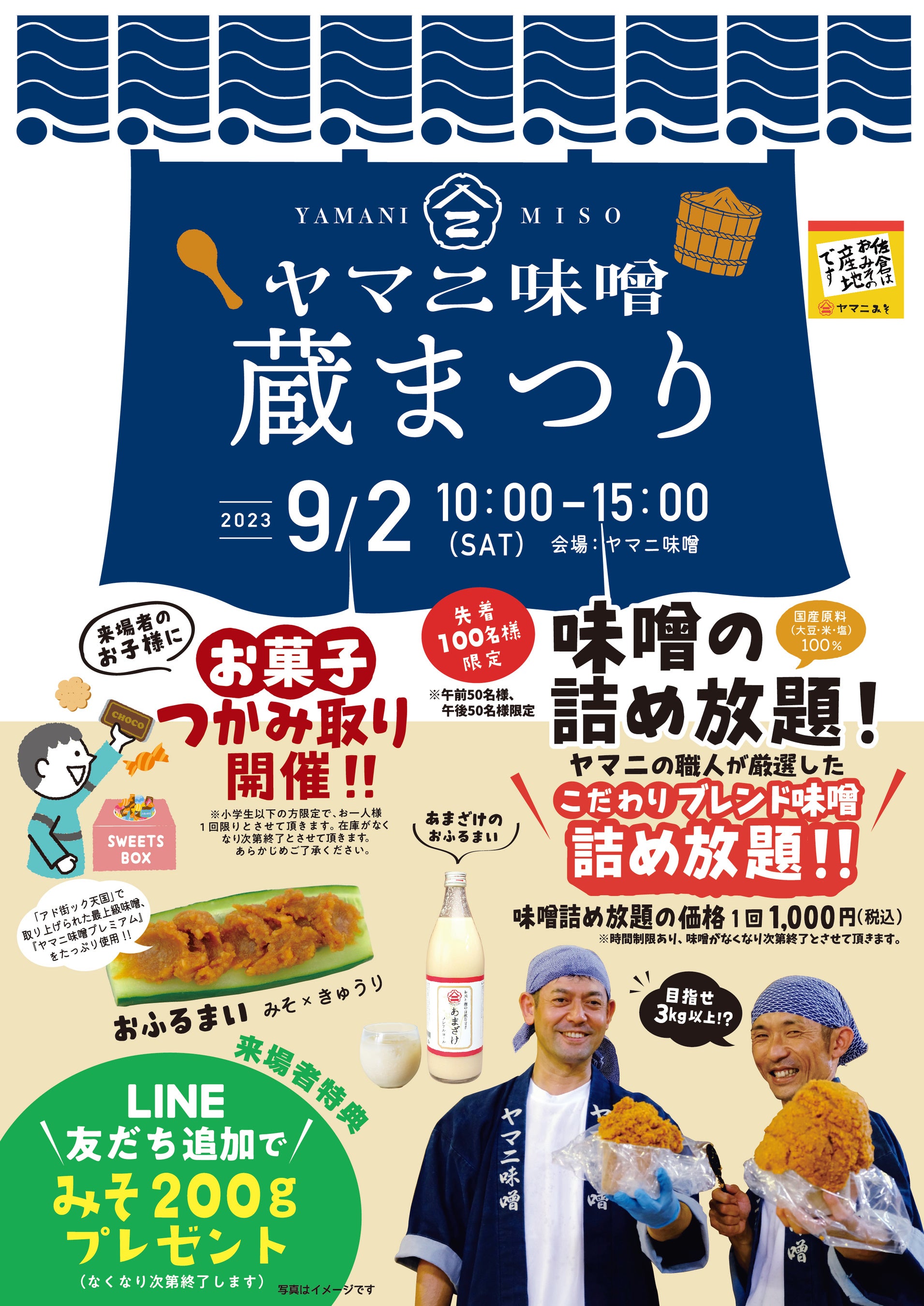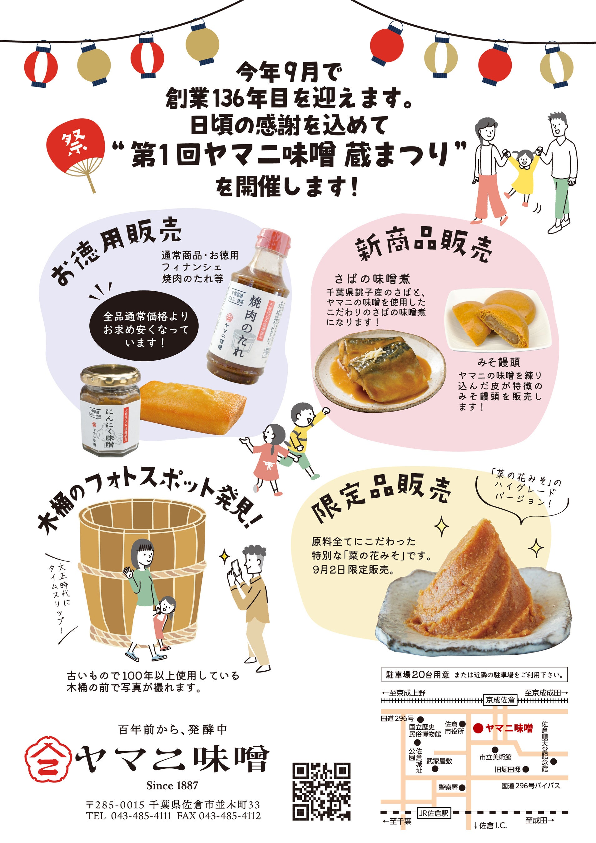 株式会社ヤマニ味噌(千葉県佐倉市)は、創業136年で初となる蔵びらきイベント「ヤマニ味噌 蔵まつり」を9月2日(土)に当社本社にて開催いたします。味噌蔵の見学や味噌の詰め放題、数量限定で甘酒や味噌きゅうりを来場者にふるまうほか、お菓子つかみ取りなどお子様やご家族連れでお楽しみいただける催しを多数用意しています。
