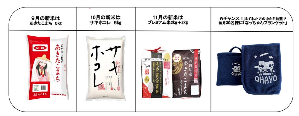 ・ 9月 :あきたこまち新米5㎏を50名様。炊きたてはもちろん、冷めてもおいしい大人気のお米です。