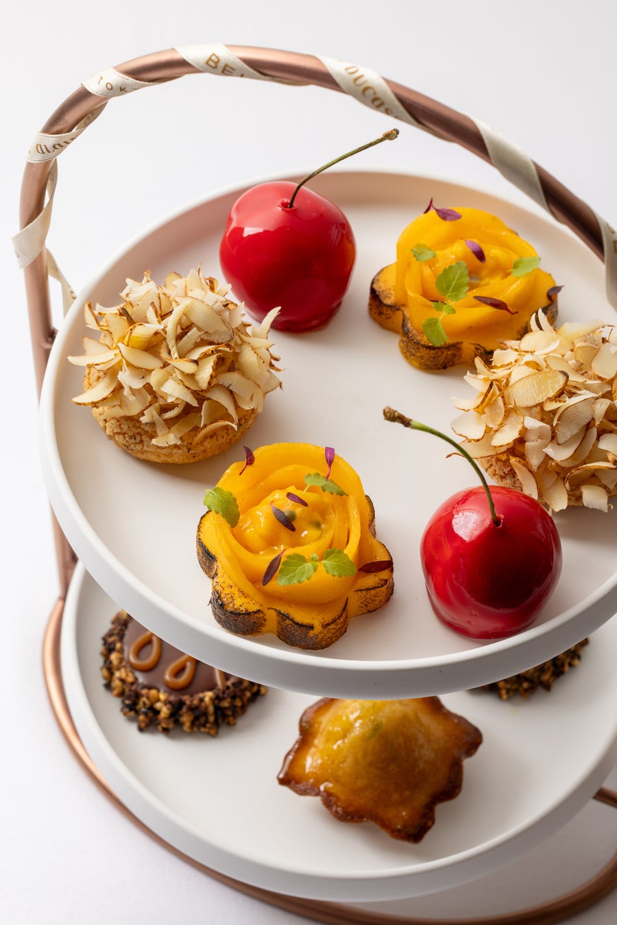 この度スタートするアフタヌーンティーでは、パティシエの繊細な手仕事をご堪能いただける、スイーツやセイボリーをご用意しました。季節ごとに装いを変えるアフタヌーンティー第一弾は、みかんをアクセントにしたオリーブオイルのアイスクリームからはじまり、カメリアの花をイメージしたマンゴー、アーモンドのフラワーペタルを纏ったシュークリーム、「ル・ショコラ・アランデュカス」のショコラを使ったサブレほか、「ベージュ アラン・デュカス 東京」のシグネチャーメニューであるカメリアモチーフのデザート「カレ・シャネル」を含む、パティシエの繊細な手仕事でオートクチュールのように仕立てられた7種のスイーツが並びます。どれもアラン・デュカスの料理哲学に基づき、糖分、塩分、脂肪分を控え、旬の素材本来の味わいを引き出しています。