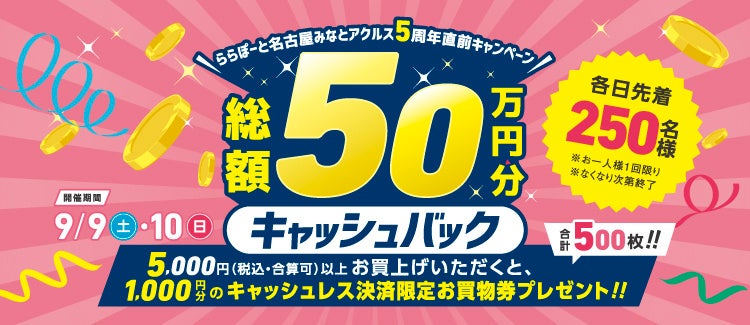 ららぽーと名古屋みなとアクルス5周年直前イベントとして、5,000円(税込・合算可)以上お買い上げの方を対象に、即日使用可能な1,000円分のキャッシュレス決済限定お買い物券をプレゼントいたします。