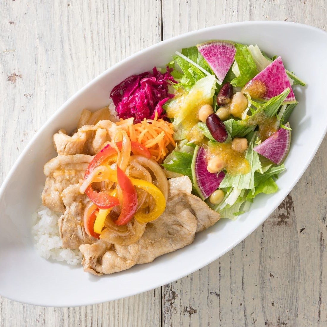 豚ロース肉を使った生姜焼きに彩り野菜をたっぷりのせて、サラダと合わせてお肉と野菜をたっぷり食べられる満足感のあるライスボウルに仕上げました。