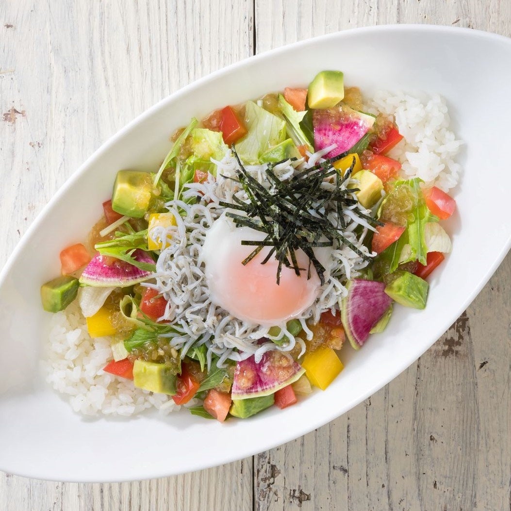 釜揚げしらす、アボカド、彩りの良いサラダをライスにのせて、日向夏ドレッシングをベースにしたわさびドレッシングで味付けしたライスボウルです。