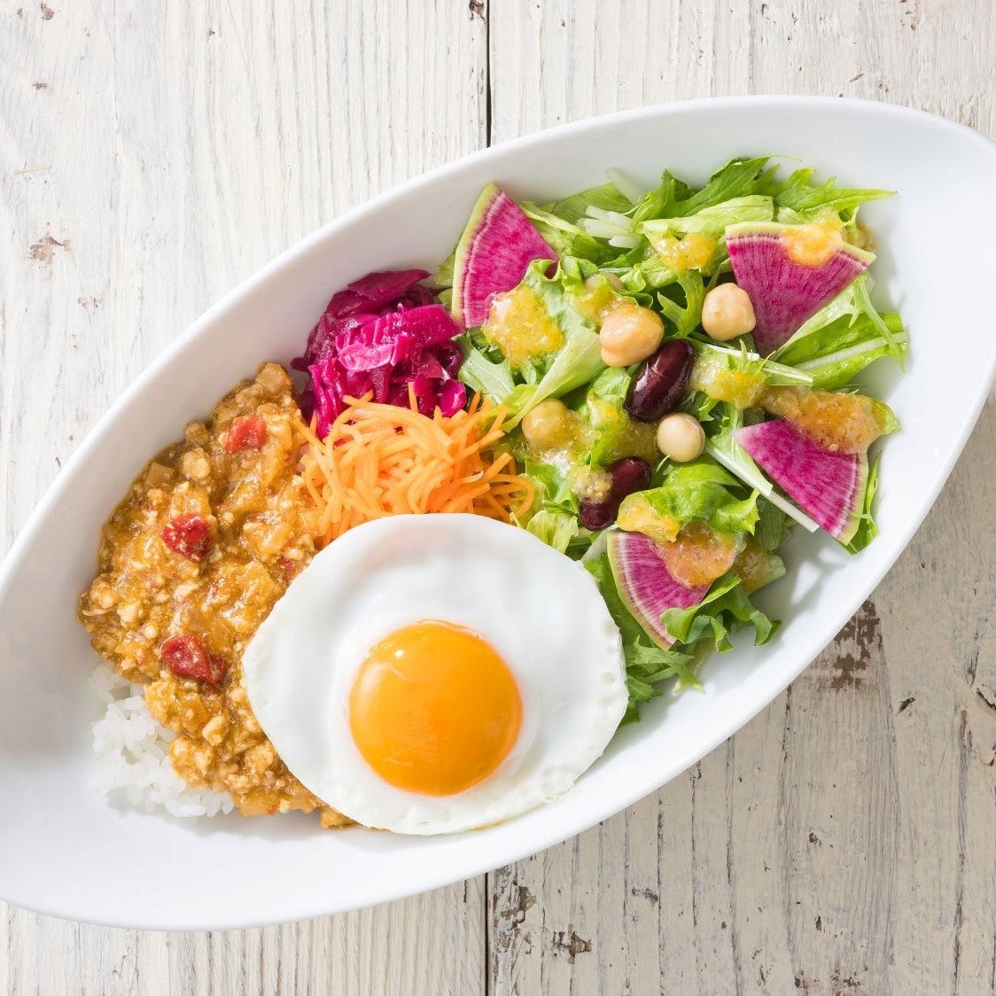 ピリ辛のガパオライスと目玉焼きとトッピングした彩りサラダをよく混ぜてお召し上がりください。