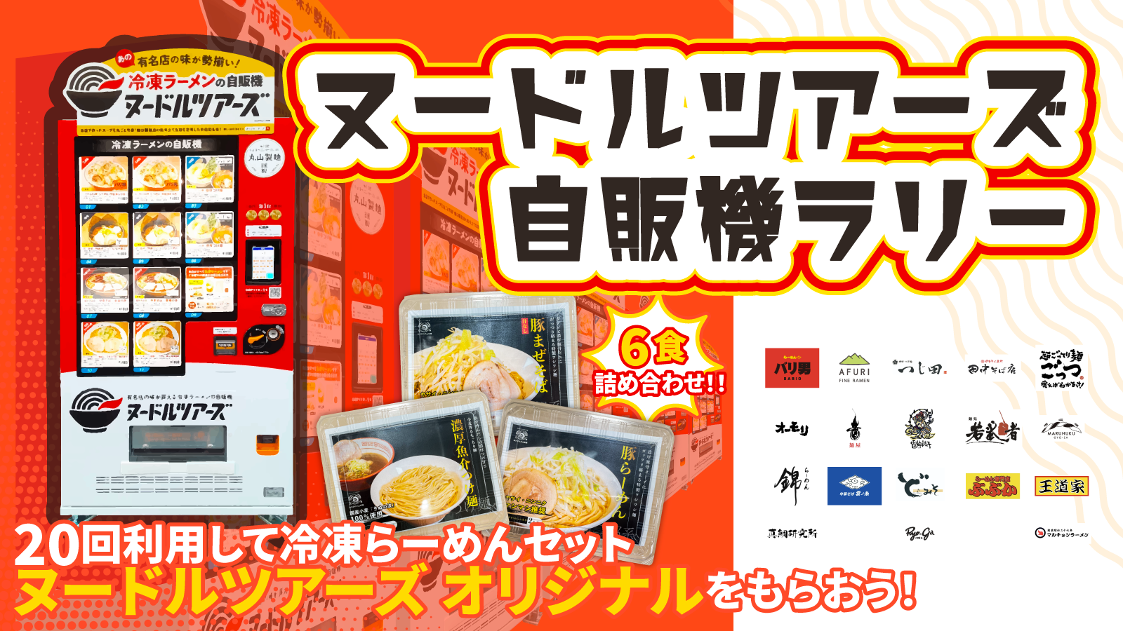 「ヌードルツアーズ自販機ラリー」は、関東近郊の冷凍ラーメン自販機「ヌードルツアーズ」にて商品を購入した後、アプリ「らーめんガチャ」内でチェックインすることで、アプリ内で開催されるスタンプラリーに参加できます。