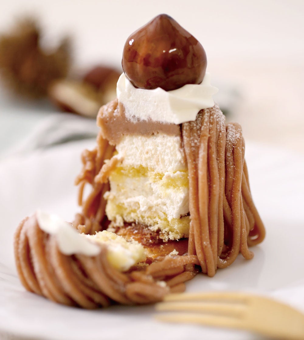 濃厚なマロンクリームの中には、しっとりとしたスポンジ、刻み栗入りのクリーム、プラリネを合わせた香ばしいフィヤンティーヌを重ねました。