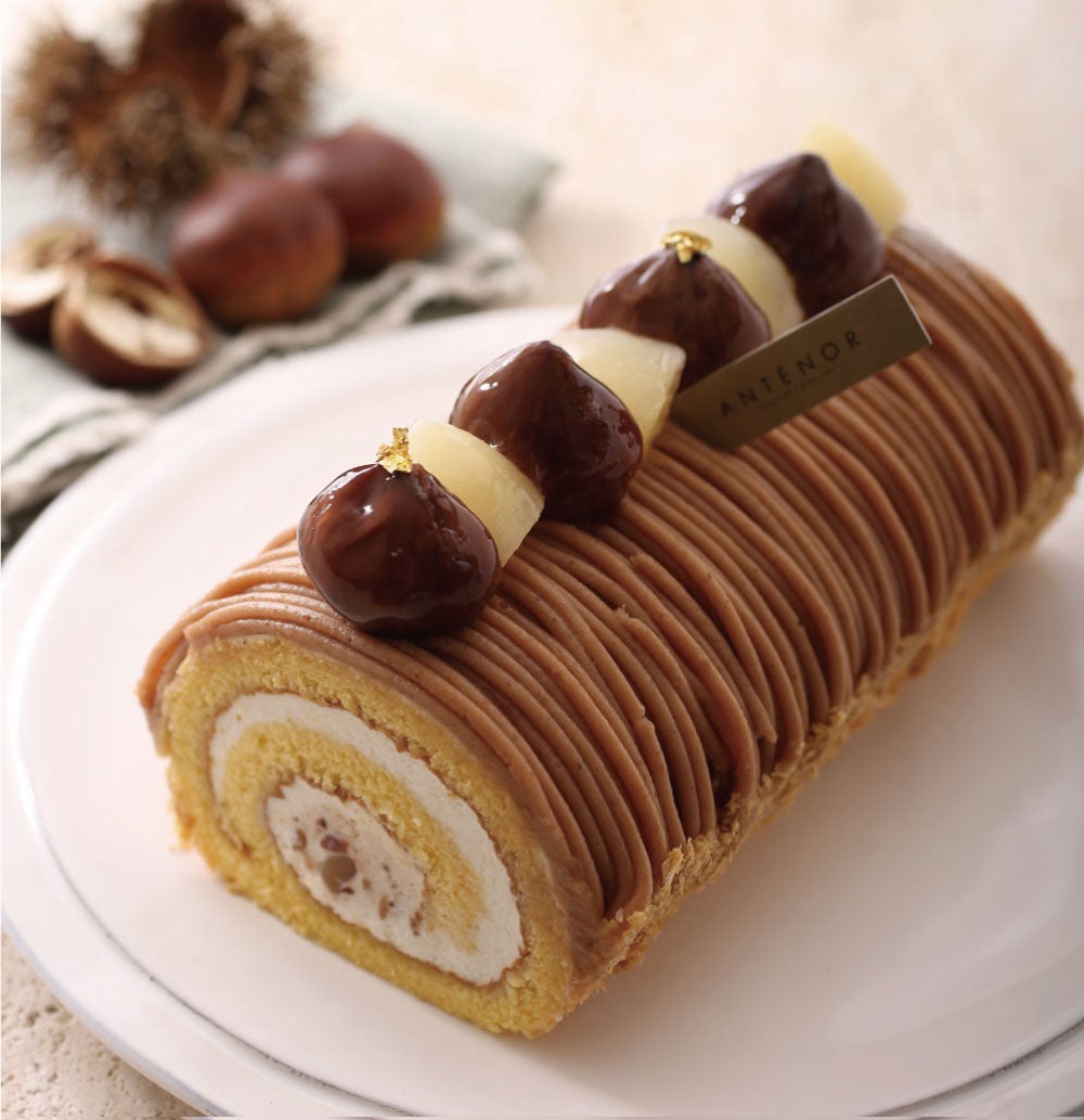 リニューアルしたマロンクリームをご堪能いただける、ロールケーキをご用意いたしました。渋皮栗入りのクリームをしっとりとしたスポンジで巻き、濃厚で芳醇なマロンクリームを絞り、渋皮栗と洋梨を飾りました。
