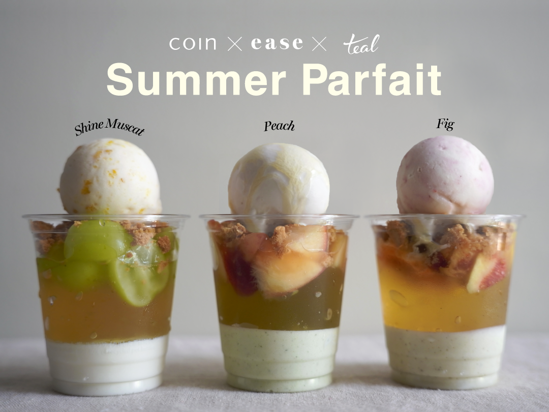 パフェは、全部で3種類。easeのフルーツマリネ、ブラマンジェに、tealのアイスクリームを合わせました。玉露のブラマンジェにパッションミルクアイスなど、ユニークな味の組み合わせをお楽しみいただけます。