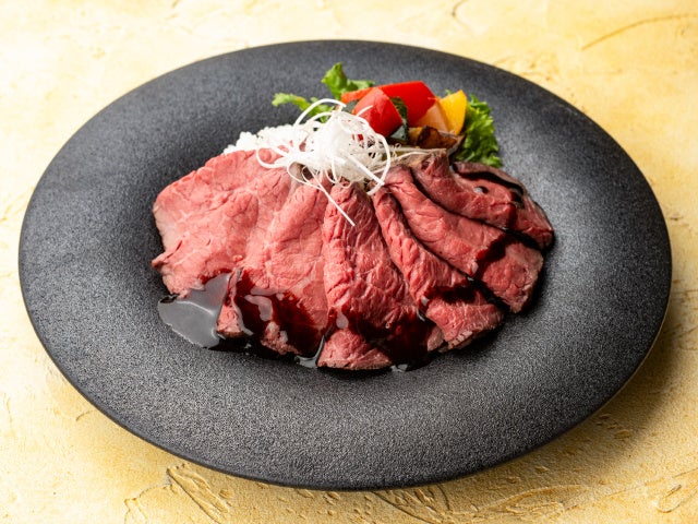 白老町 敷島ファームの黒毛和牛「ピリカルージュ」のモモ肉を、じっくり低温調理し旨味をぎゅっと凝縮させたローストビーフに。