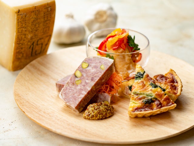 豚肉・鴨肉・リドヴォー・ビスタチオなどを使った自家製のパテと、マトウ鯛を素揚げし甘酢漬けにしたカルピオーネ、ベーコンと夏野菜を使ったキッシュの3種類をセットにした、ワインによく合うアンティパストです。