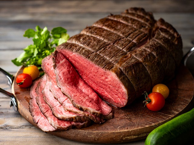 白老町 敷島ファームの黒毛和牛「ピリカルージュ」のモモ肉を、じっくり低温調理し旨味をぎゅっと凝縮させたローストビーフに。