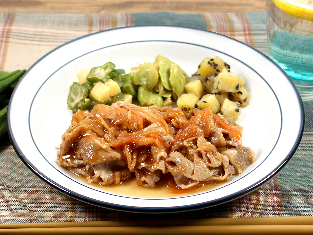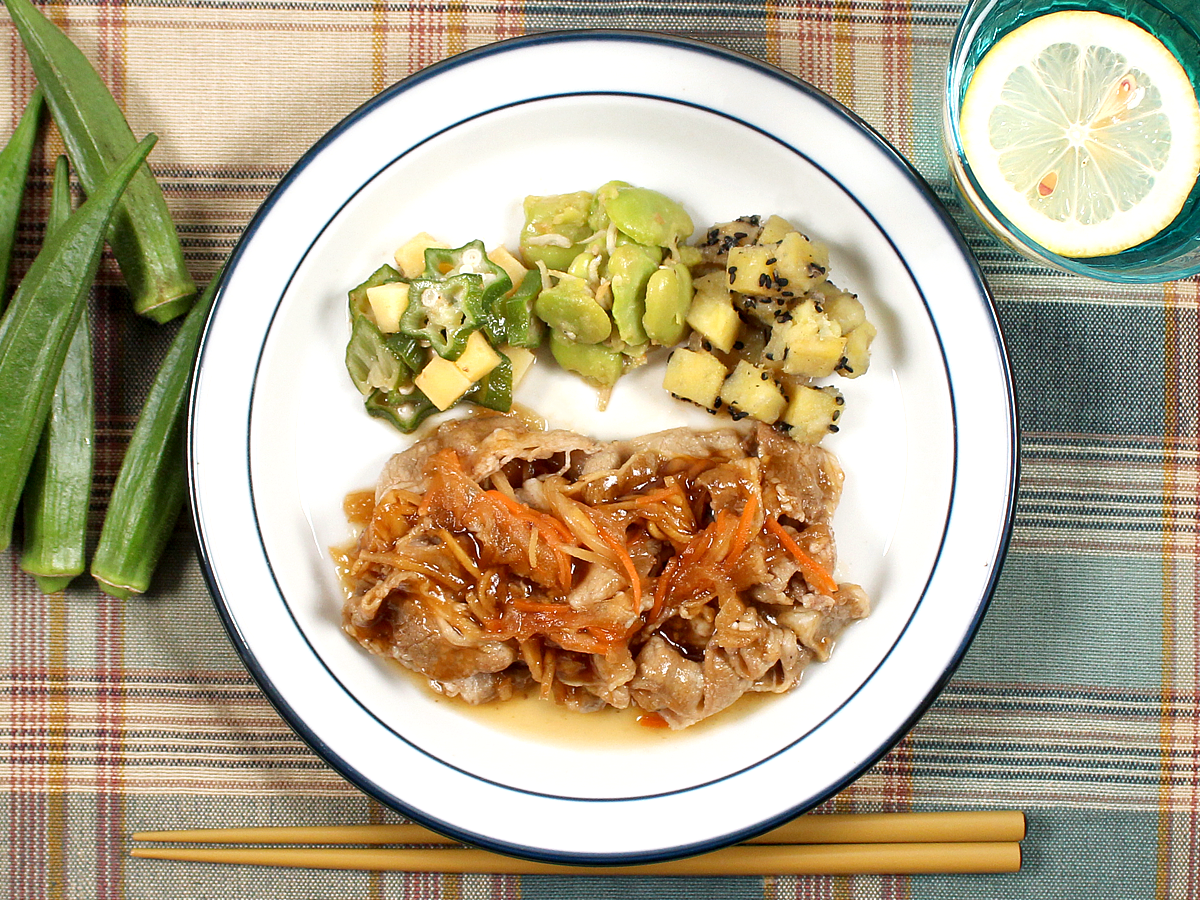 副菜は、じゃがいもを加えたおくらのごまぽん酢、しらす干しの入ったそらまめのあえ物、黒ごまをからめた蒸しさつまいもです。